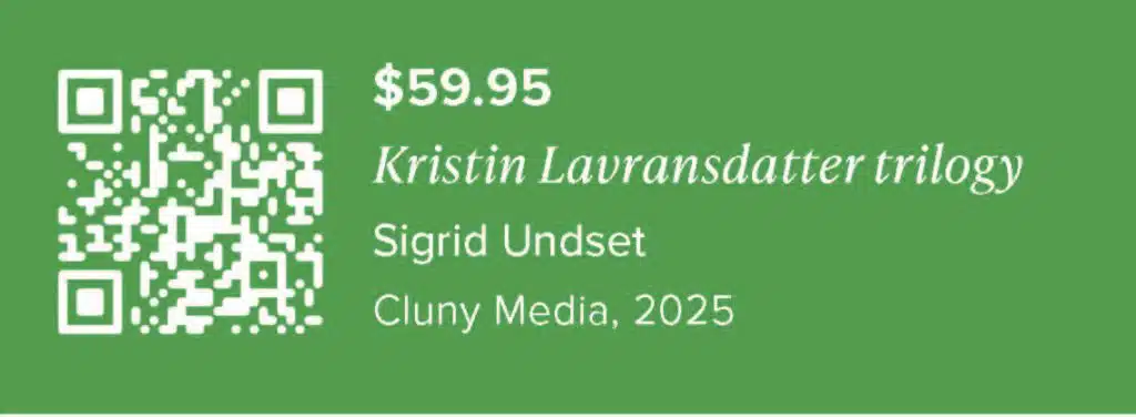 Thus, I am grateful to Cluny Media for the lovely new edition of Kristin Lavransdatter, available in three accessible volumes. It is important to note at the outset that this is not a new translation from Undset’s original Norwegian. Rather, it is a reprint of the original English translations by Charles Archer and J.S. Scott, first published from 1923 to 1927. This translation was superseded in some readers’ judgment by Tina Nunnally’s translation, published from 1997 to 2000. I prefer the Archer/Scott translation because they try to translate archaic Norwegian into roughly-equivalent period English. Put simply, the Cluny edition prefers terms like “thy, thou, and thine” over modern English equivalents. The result is a satisfying lyrical participation in the novel’s medieval setting.