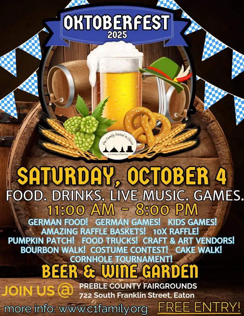 A fun-filled, family-friendly day celebrating community, tradition, and the joy of fall! This FREE event is open to everyone in the community—bring your family, neighbors, and friends! ✨ Enjoy all the festivities: Live German Music & Entertainment️ Authentic German Food & Desserts Beer & Wine Garden Kids’ Games & Activities Artisan & Craft Vendors Pie Auction Pumpkin Patch Costume Contest German Games & Raffle Cornhole Tournament And so much more! Oktoberfest is hosted by the C-1 Family of Parishes: St. Mary (Oxford), St. Mary (Camden), St. John (New Paris), and Visitation BVM (Eaton).