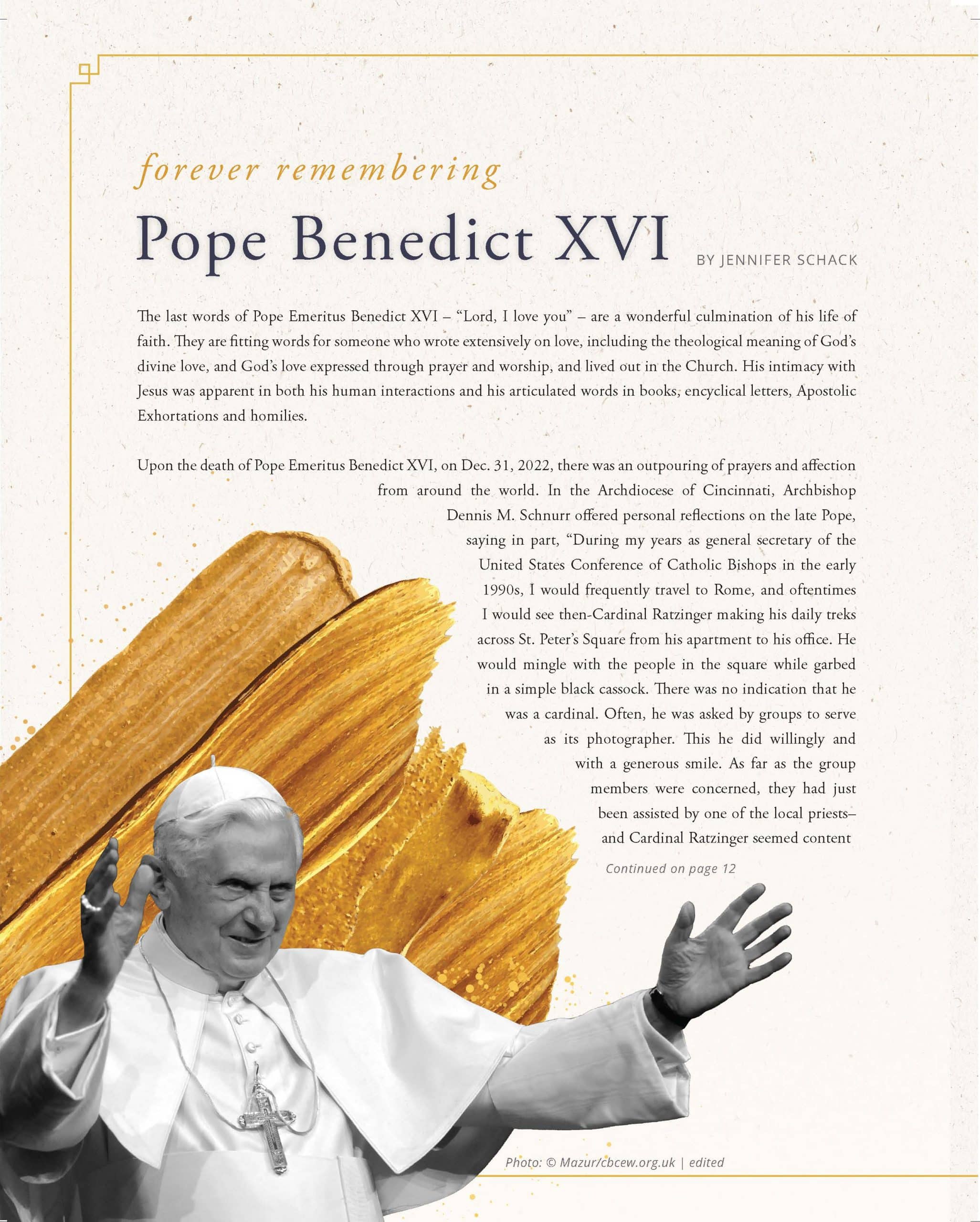 Home»Features»forever remembering Pope Benedict XVI Features forever remembering Pope Benedict XVI The Catholic Telegraph 2023-01-27 The Catholic Telegraph / January 27, 2023 / 47 0 Shares Facebook Twitter Pinterest WhatsApp Tags:Death of Pope Benedict XVIFuneral for Pope Benedict XVIJennifer SchackPope Benedict XVI