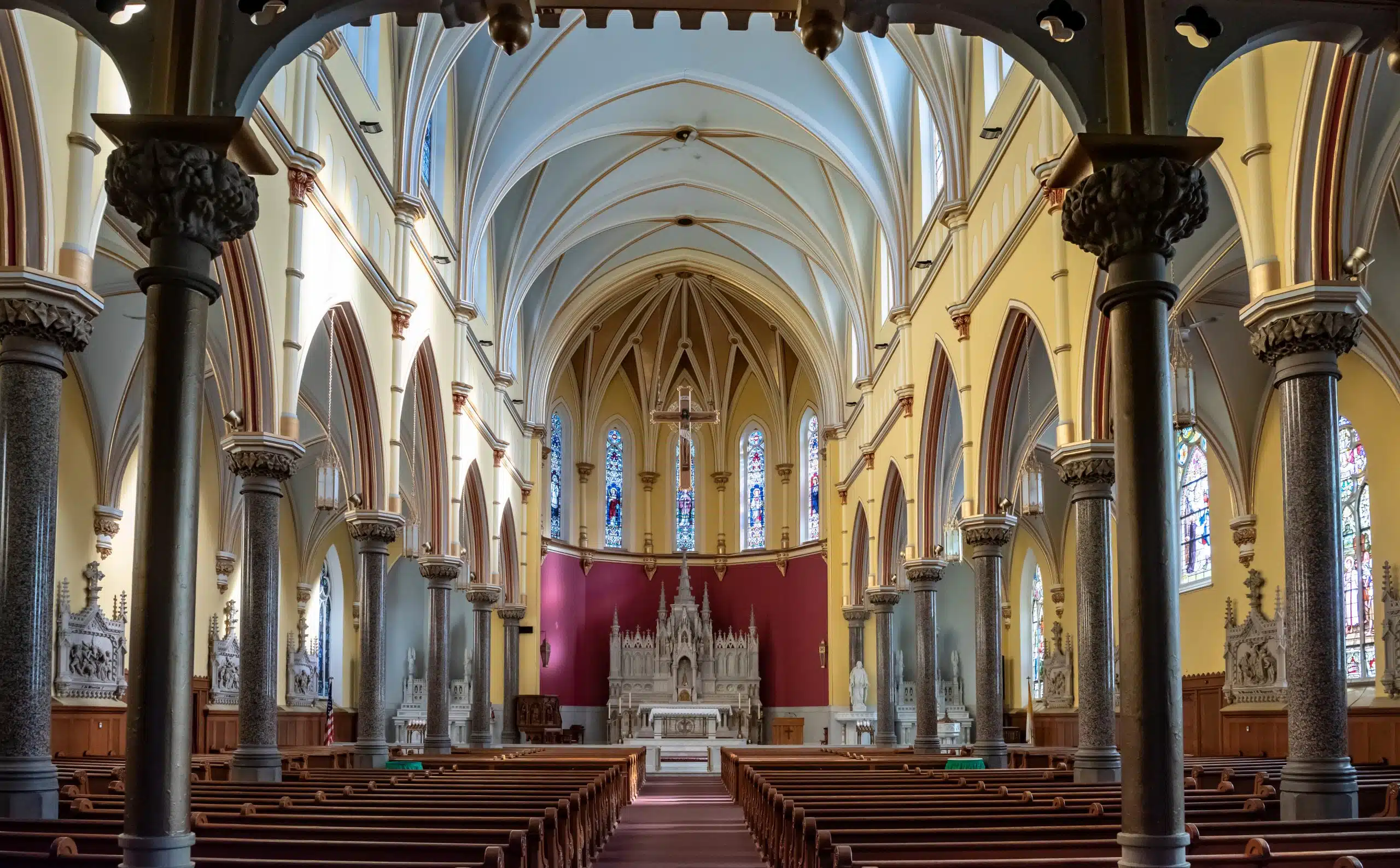 The church was finished and dedicated. It features an ornate exterior: a large number and variety of stained and art glass windows, the largest made in 1912 by the Emil Frei Art Glass Company of St. Louis; an elaborate carved high altar made of marble and onyx; marble side chapels and communion rails; a carved and gilded organ loft supported by metal pillars; extensive carved Gothic woodwork; a gilded groined ceiling with carved details; and three towers—the highest reaching to 189 feet.