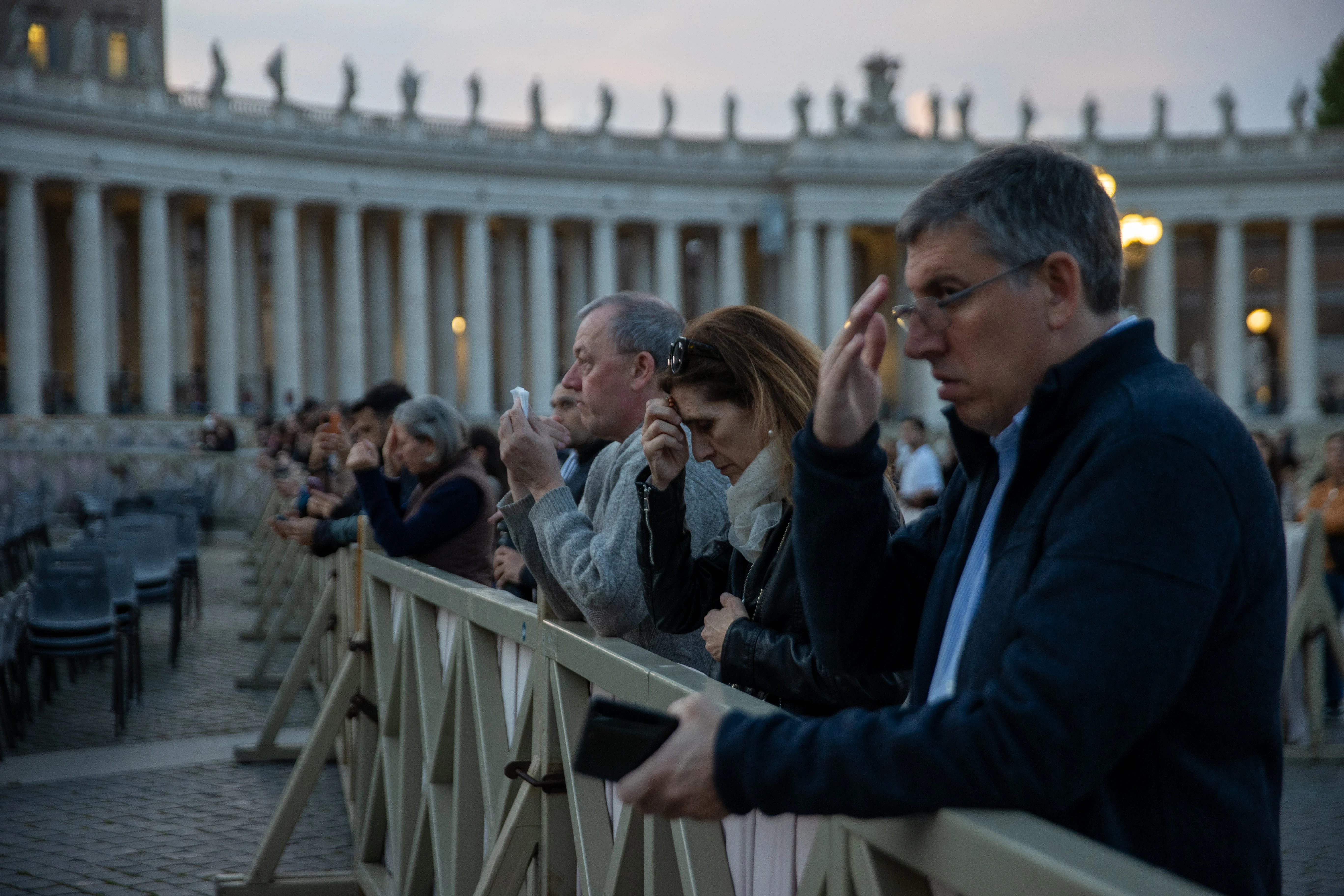 Thousands of faithful gather in St. Peter’s Square Tuesday evening to pray the Rosary for the soul of Pope Francis, led by Cardinal Giovanni Battista Re, Dean of the College of Cardinals.