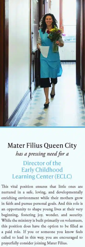 The work of Mater Filius Queen City is not merely a program—it is an apostolate, a living expression of the Gospel in action. It is the Church being the Church: welcoming, protecting, nurturing, and celebrating life at every stage. In a culture that often fails to see motherhood’s beauty, Mater Filius stands as a beacon of hope, affirming that no woman should have to face pregnancy alone, and no woman or child should be considered anything less than a blessing.