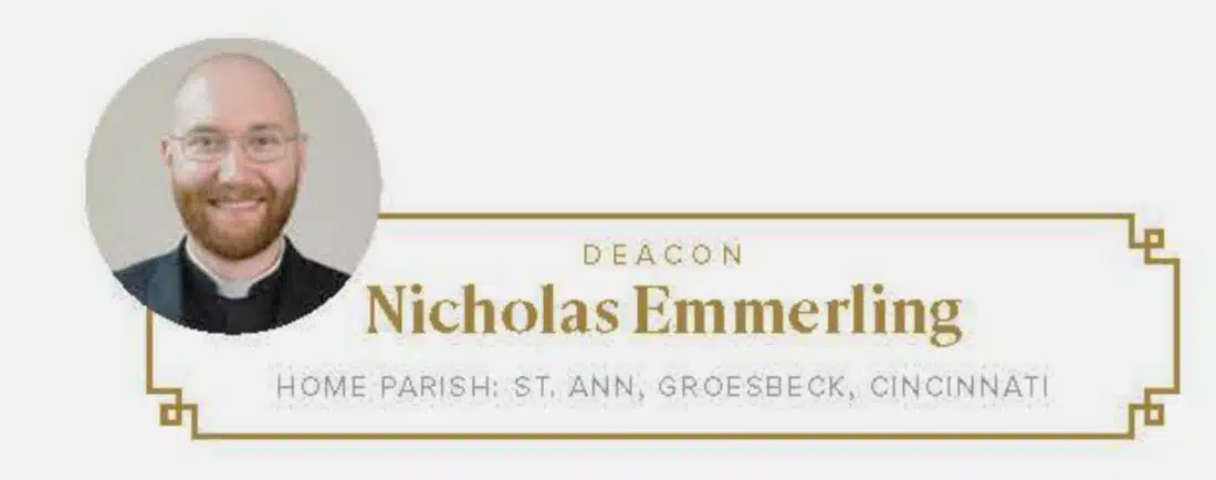 Deacon Emmerling is the oldest of eight children from a devout Catholic family. He grew up on Cincinnati’s west side, near St. Ignatius Church. He inherited a love of cooking from his parents and enjoys cooking for others. Because of his family’s special devotion to St. Joseph, this saint is his favorite—and is the confirmation patron for both the deacon and his father. Deacon Emmerling said St. Joseph helped him during his discernment, and he is excited to see what this saint’s intercession will accomplish in his life after ordination.