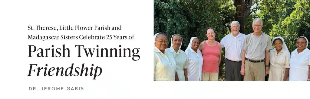 Twenty-six years ago, Sr. Francis Maag, CDP, was the parish director of religious education and attended a general meeting of her congregation, the Congregation of Divine Providence, in Madagascar. She returned on fire with zeal for the missionary work of her fellow Sisters in Madagascar. Concurrently, a group of Little Flower parishioners was exploring how to build an outreach relationship with a service group or organization outside the parish boundaries. In July 2000, the group voted to form a twinning relationship with the Sisters of Divine Providence in Madagascar, and within a few months, Little Flower Pastor Fr. Tom King and the parish council also voted to endorse the establishment of this relationship in a covenant of friendship. The Sisters in Madagascar also endorsed this covenant, and visited Little Flower Church around the same time.