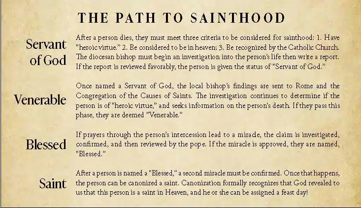 The other four candidates (Pierre Toussaint, Mother Mary Lange, Henriette Delille, Fr. Augustus Tolton) have achieved the next designation, “Venerable.” Their causes have reached the Congregation for the Causes of Saints, and nine theologians have judged that their lives were heroic. The pope at the time approved the judgment, and thereby, these four were declared Venerable. They will be beatified after a miracle is attributed to their intercession, elevating them to “Blessed” status. Finally, after another miracle, canonization will take place and the person will receive the title of “Saint.”